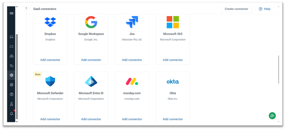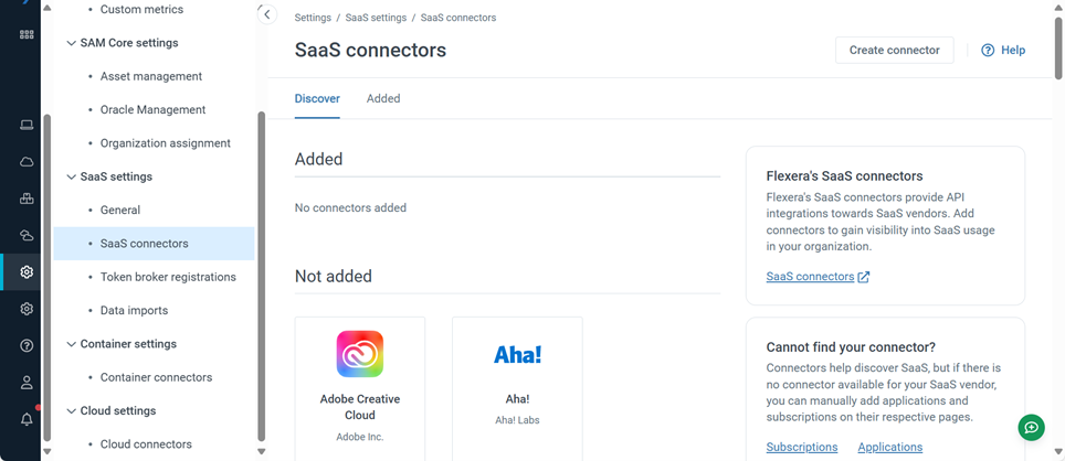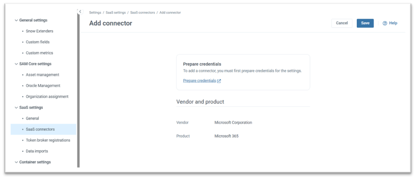 • Gestione in Settings → SaaS → SaaS connectors (ruolo: Snow Atlas Administrator).