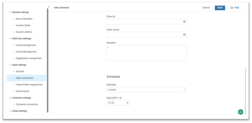 5. In Snow Atlas → Add connector → compila Tenant/Client/Secret e campo Domains (* per tutti i domini; coerenza con Entra ID).