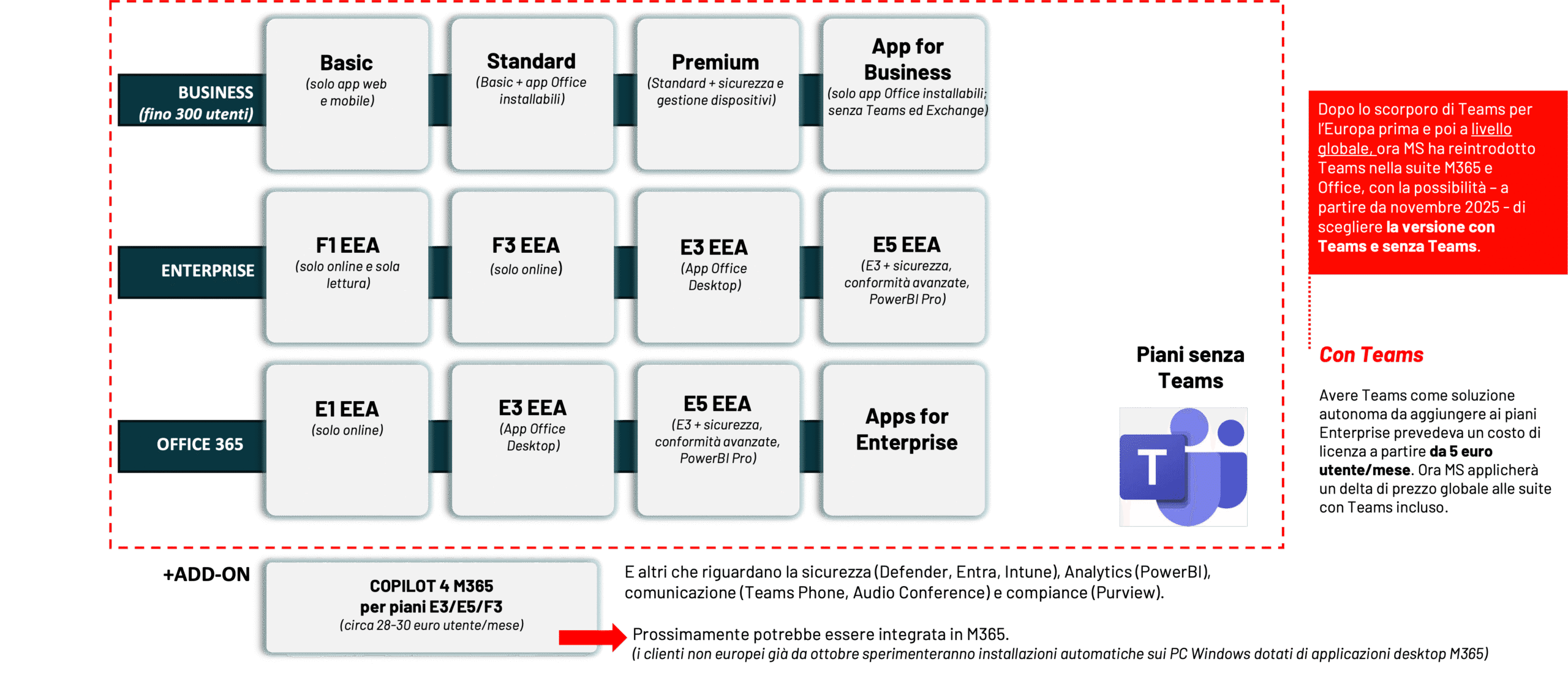 Microsoft ha iniziato nell’ottobre 2023 a scorporare l’app Teams dai pacchetti Microsoft 365 e Office 365 venduti in Europa (EEA e Svizzera), per poi estendere questa nuova struttura a livello globale dal 1° aprile 2024. In molti casi, soprattutto nei piani Enterprise, Teams non è più incluso di default e deve essere acquistato come licenza separata. Questo richiede di valutare con attenzione l’impatto sul budget, sia al momento della scelta del piano iniziale sia in fase di rinnovo o aggiornamento. Ne abbiamo parlato anche qui, con la news che ora sembra che sarà possibile scegliere anche pacchetti con Teams incluso.