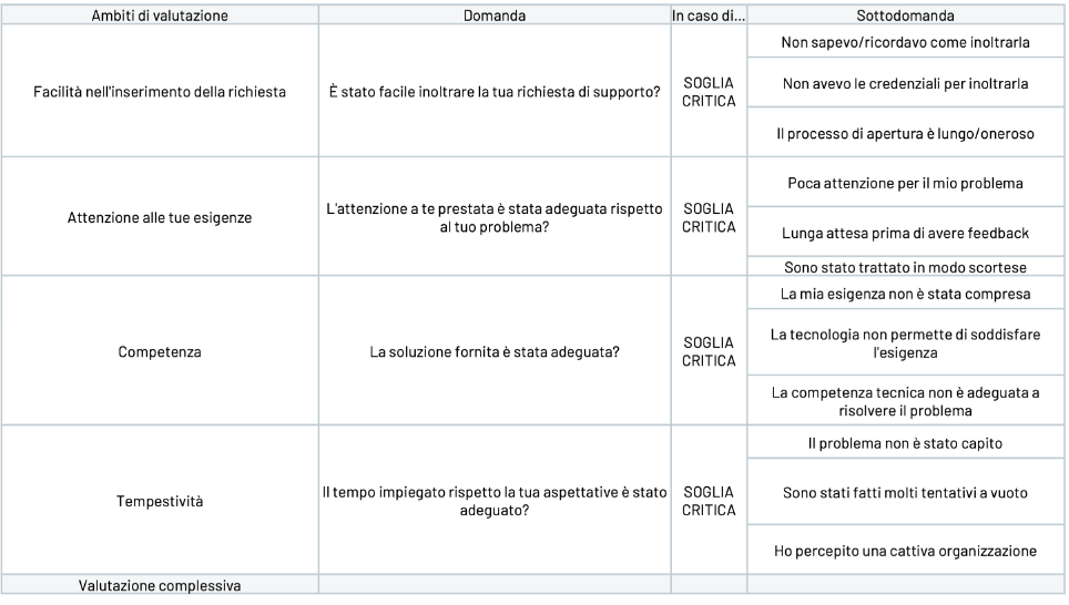 Abbiamo suddiviso l’esperienza in tre momenti chiave — apertura, gestione e chiusura del ticket — e per ciascuno abbiamo individuato gli aspetti che influenzano maggiormente la percezione del servizio, così da poterli approfondire nel questionario di feedback che avremmo inviato.