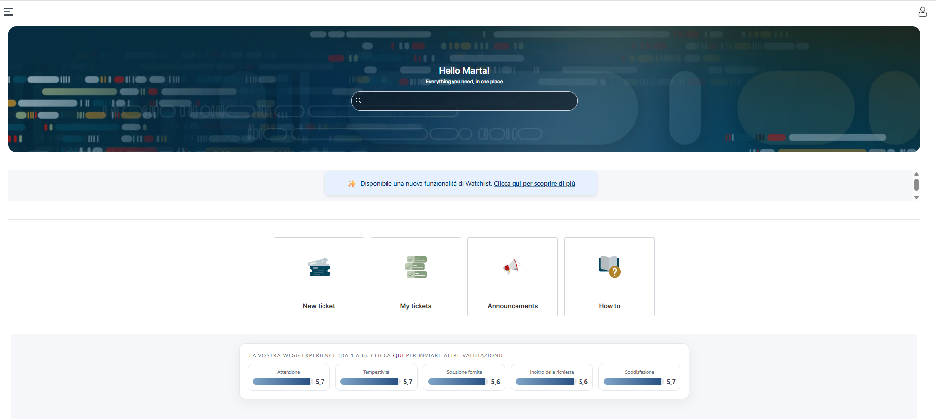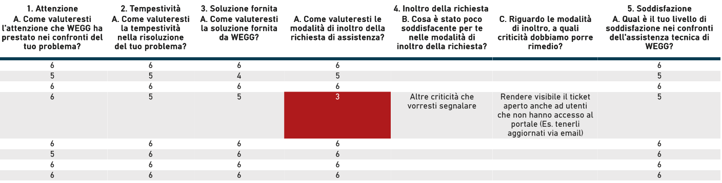 Infine, abbiamo poi deciso di rendere visibili in modo aggregatogli indicatori dell’esperienza che stanno vivendo i clienti WEGG all’interno della Home del nostro Portale di Assistenza Tecnica. Un modo per garantire la massima trasparenza e, allo stesso tempo, mantenere alta l’attenzione all’interno del nostro team affinché le valutazioni restino sempre positive.